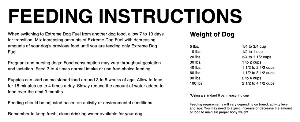 Listed below are a variety of specifications and benefits for all the Extreme Dog Fuel food we have available. If you would like support in finding the best fit for the breed/activity level and age of your dog, please fill out this form here or text or call 435-757-9642.